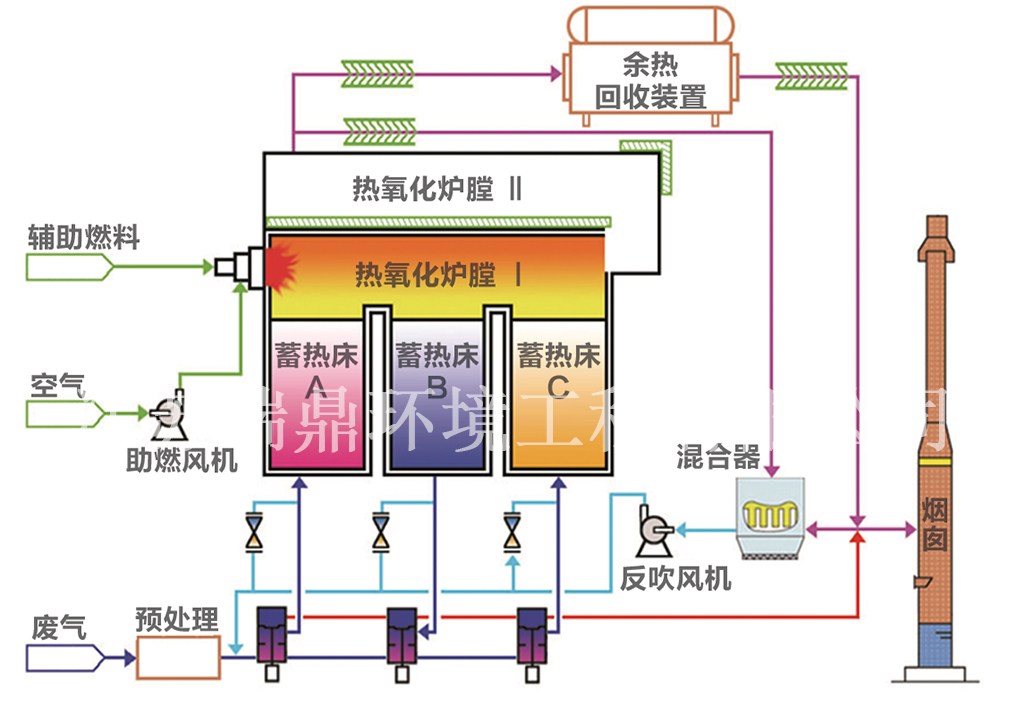 蓄热式热力焚烧炉适用于几乎所有行业排出的各种风量、组成、浓度的有机废气,具有热回收效率高、排放浓度低的特点。江苏瑞鼎环境设计的蓄热焚烧炉还可以耦合废液协同处理、高回收率余热利用,NOx排放更少。