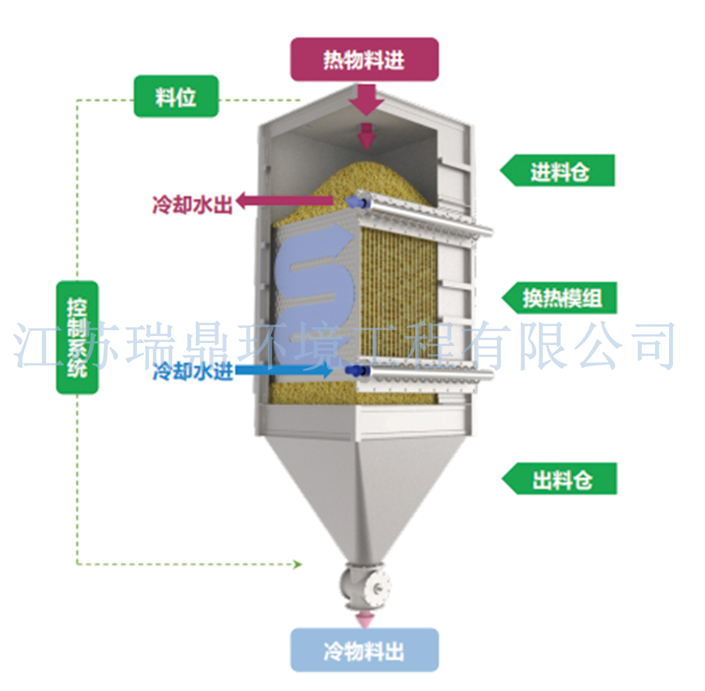 江苏瑞鼎的固体换热器采用密相输送技术与专利枕形蜂窝式双通道传热板组设计,节能率高达 90% 且近乎零排放。全密闭立式结构占地小、模块化扩展便利,快开门设计便于维护。
